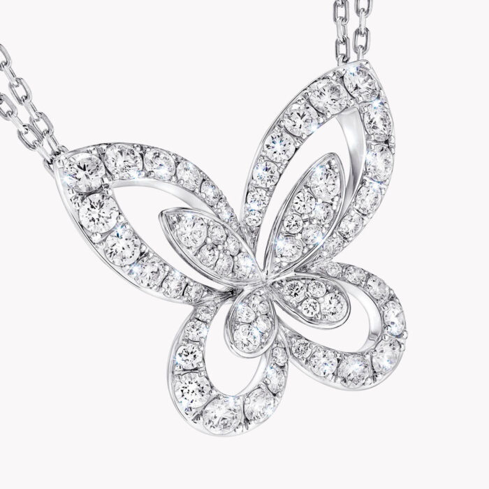 A tender depiction of a butterfly with wings outstretched, outlined in scintillating pavé diamonds, the large Butterfly Silhouette pendant in white gold perfectly captures the delicate beauty of one of nature’s most captivating creatures. Presented on a white gold chain, clusters of pavé stones form a second butterfly silhouette in the centre, bringing a subtle sense of three-dimensionality to the pendant.