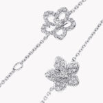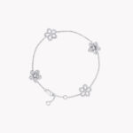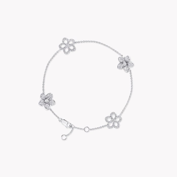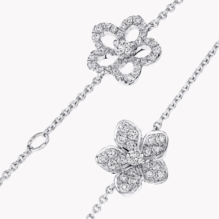 Four diamond flowers blossom upon our Wild Flower bracelet, unique down to every petal. Arranged with a wild touch, the two different styles of flower are exquisitely crafted to stand out, for an effect of both delicacy and strength. The Wild Flower collection is an invitation to escape into a garden that grows just for you. From trios and individual blooms to floral clusters and blossoms laid out in a row, each Wild Flower jewel is a statement of delicacy and of empowerment, designed to be worn in profusion.